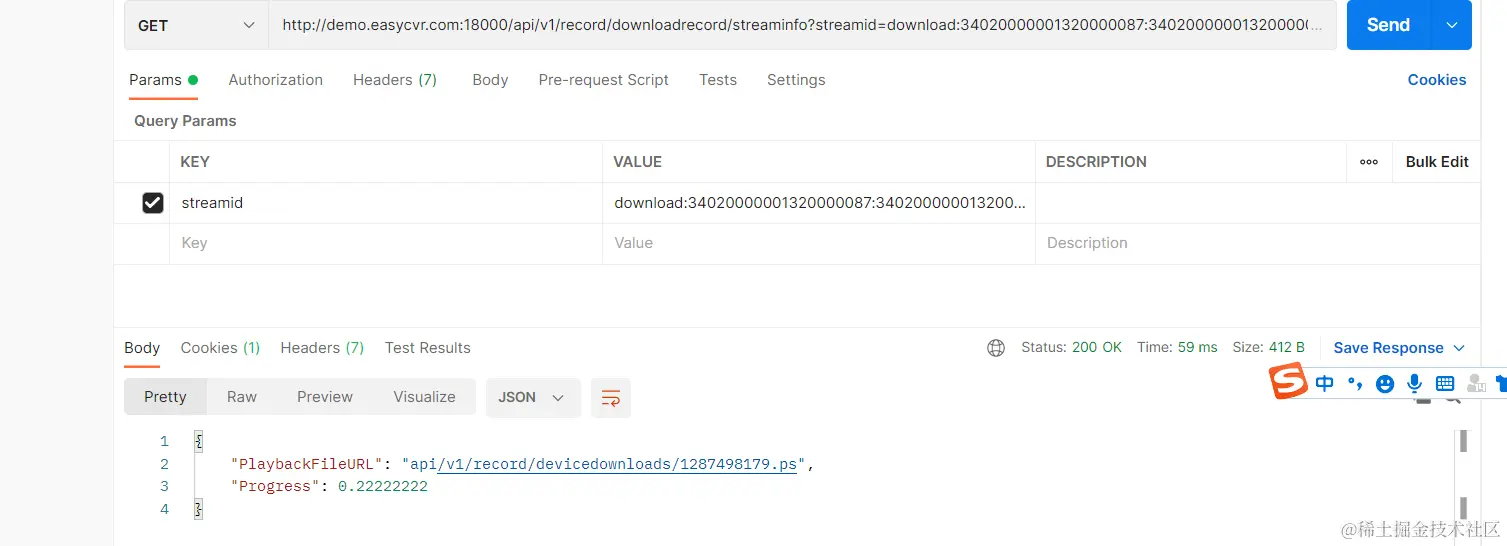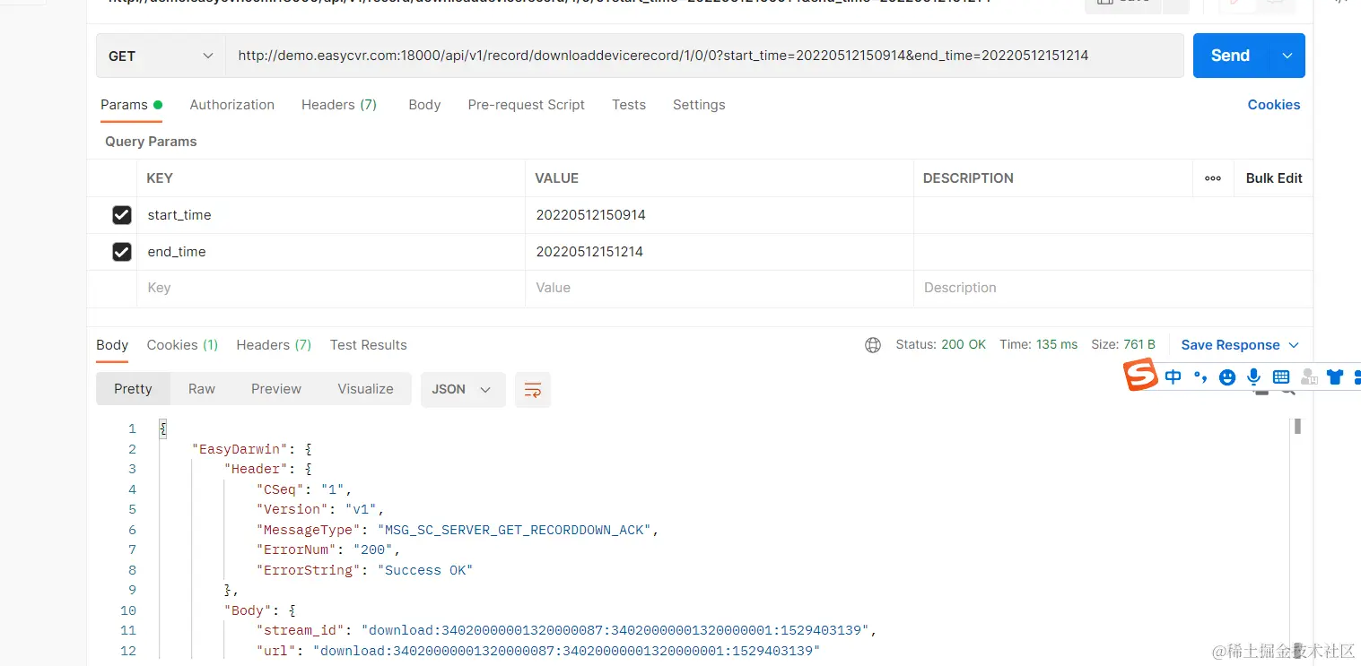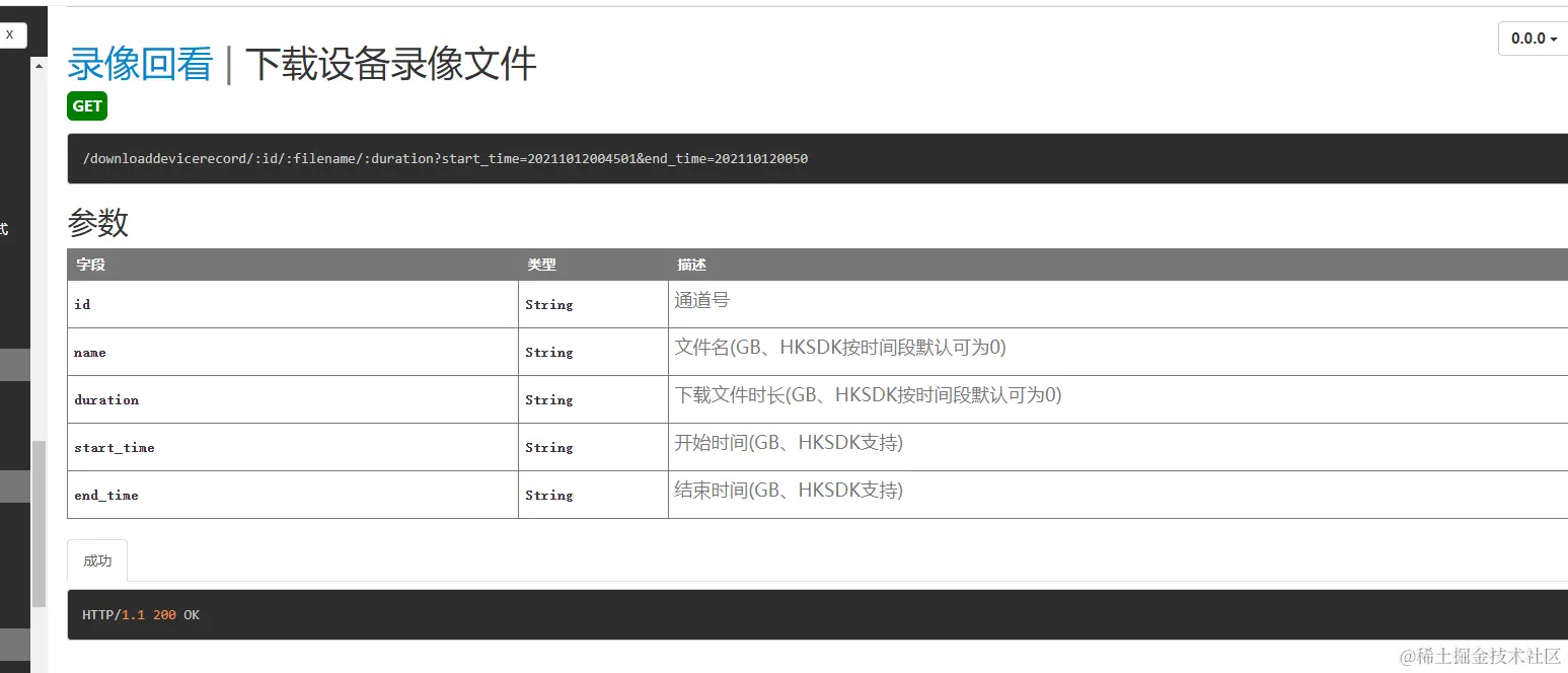3)获取后,通过以下接口获得设备录像回放文件的下载地址,拼接后就能获取视频文件:
