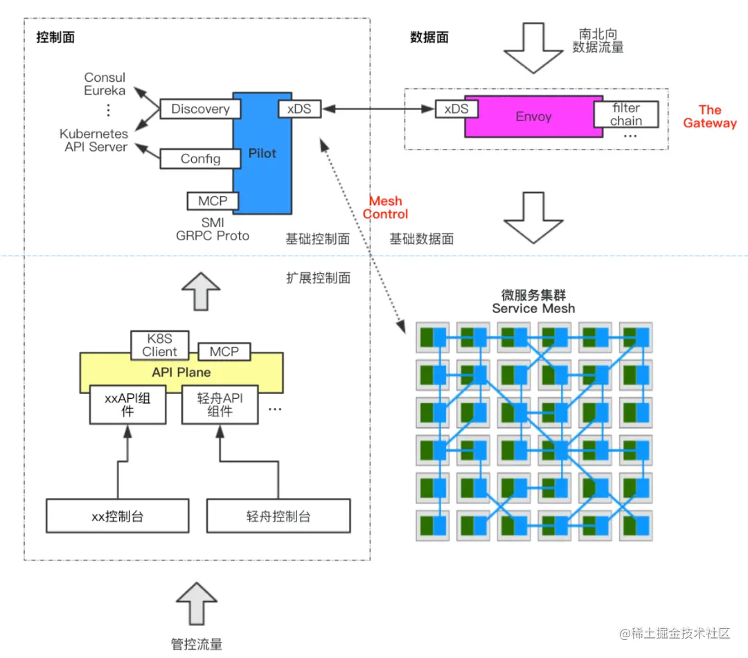 网易严选网关的升级,则考虑轻舟微服务体系的无缝融合以及主流的产品实现,同样采用 Envoy 数据面组件,负责南北向数据流量的代理、路由、治理、遥测等;通过 filterchain 进行扩展,支持基于 Lua、C++ 语言编写插件,WASM 落地后支持多语言方式扩展;并通过 xDS 与控制面组件进行配置下发等动态控制。控制面则以 Istio Pilot 作为基本控制面组件,同时提供 API 层、控制台供用户或第三方平台接入。