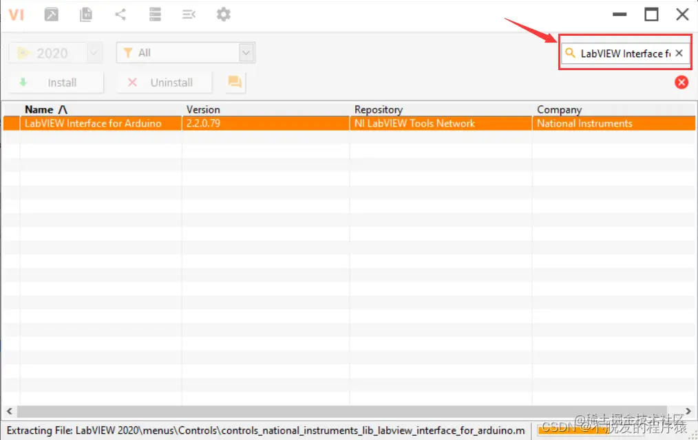 LabVIEW Interface for Arduino Toolkit工具包的安装非常简单,在VI Package Manager,搜索LabVIEW Interface for Arduino就可以进行安装,如下所示: