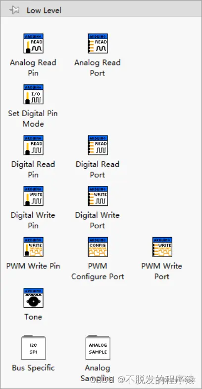 Low Level函数库包含:模拟输入、数字IO配置、数字输入、数字输出、PWM输出(模拟输出)、Tone、I2C、SPI、模拟采样功能,如下图所示: