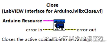 输入参数为Arduino资源号,只有错误输出。其功能是断开Arduino与LabVIEW的连接,释放Arduino控制器的串口资源。