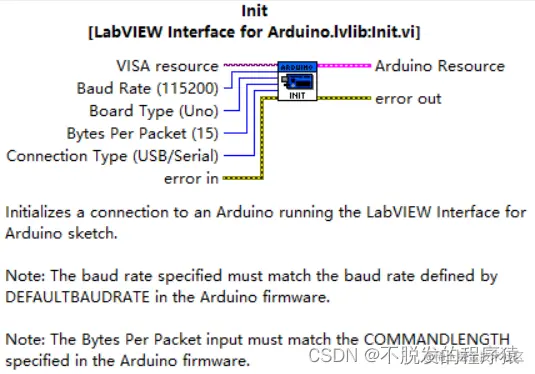 输入参数有VISA resource、波特率、Arduino板的类型、连接方式(USB/Serial),输出参数为Arduino资源号,提供给后续函数对Arduino进行操作。它的功能是连接Arduino控制器,以使得Arduino板进入受LabVIEW控制的状态。除了VISA之外,其他的输入参数可以不给定,即使用默认参数,波特率115200,Arduino Uno板,USB/Serial连接方式,每个包15个字节。