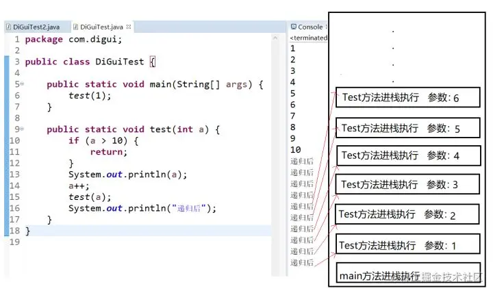 第二个问题,由于程序运行是从上往下的,所以一运行到递归就走递归的方法,实际第一个方法很痛苦,它一直在叫:“上面的哥们能快点吗?你们压着我运行不了,我很难受!”。所以早进栈执行的方法一直在等待,等待什么呢?等待他上面的递归方法弹栈消失,只有他上面的方法执行完才能轮到他。毕竟它上面压着九个哥们呢,这九个哥们不起来,最底下的你能起得来?