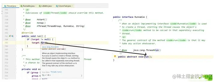 细节拉满!从源码中可以看出FutureTask继承了RunnableFuture接口,而RunnableFuture接口从源码中也可以看出它继承了Runnable接口。那是不是可以说FutureTask是Runnable类型了。
