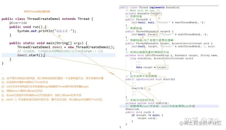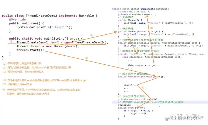 这里需要特别注意,方式一中的run方法是Thread类自己的,而方式二中的run方法是重写的Runnable接口中的run方法。Thread类和Runnable接口都有run方法,这里希望大家注意一下。 并且上个图的第六步是调用了Runnable中的run方法,由于图下载下来不清晰就不改了。