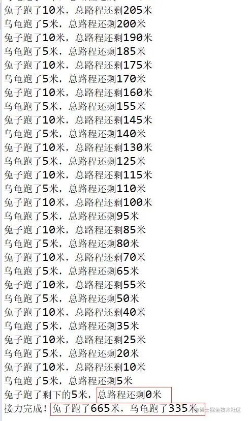 System.out.println("接力完成!兔子跑了" + tuju + "米,乌龟跑了" + guiju + "米");