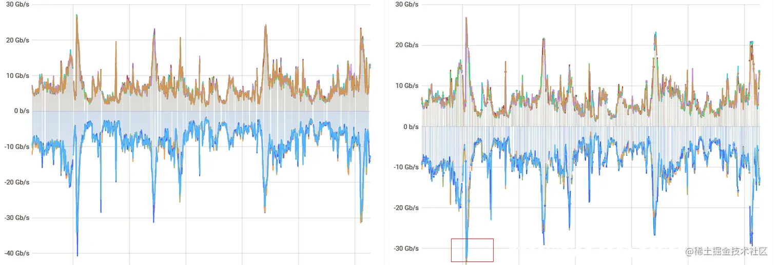 这种情况也是namenode检测到节点掉线,会启动副本机制补足该节点上的所有副本,这个时候很容易出现RPC风暴,对于网络带宽也是个很大的挑战。这种如果集群3副本机制,同时掉线两台也不会出现真正数据丢失;同理集群是2副本的话,同时出现一台异常,也不会真的数据丢失。一般这种情况被动的做法是等待6小时,等待完成全量块汇报找回结果。如下出现节点掉线后的带宽监控,网络风暴