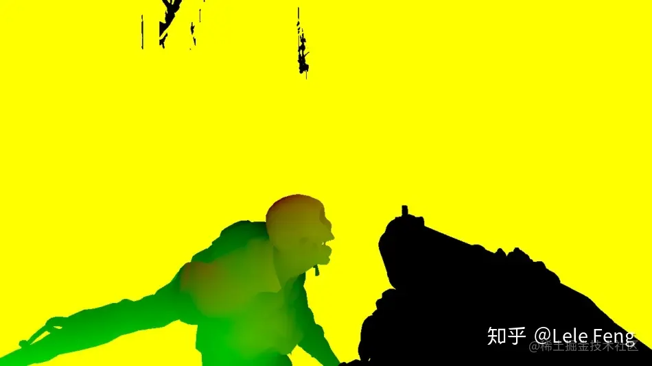 Depth pre-pass 还会负责输出 velocity 信息。当动态物体被渲染到 depth map 中时,还会计算它们逐像素的 velocity 并写入到 velocity map 中。Velocity map 只需要两个通道来表示动态物体在水平和垂直方向上的移动速度,例如下图中的武器移动范围很小,因此它的 velocity 几乎是全黑的。黄色部分是 velocity map 的默认颜色,这些区域只需要通过它的 depth 信息和 camera velocity 计算速度值即可: