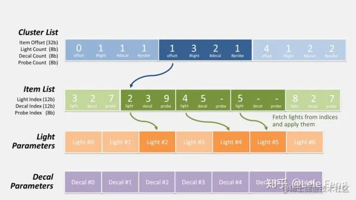 - 然后 GPU 会渲染每个像素。根据该像素的屏幕坐标和深度,可以判断出它属于哪个 cluster,从而可以得到该 cluster 会受哪些 lights 和 decals 的影响,计算它们对光照的贡献。