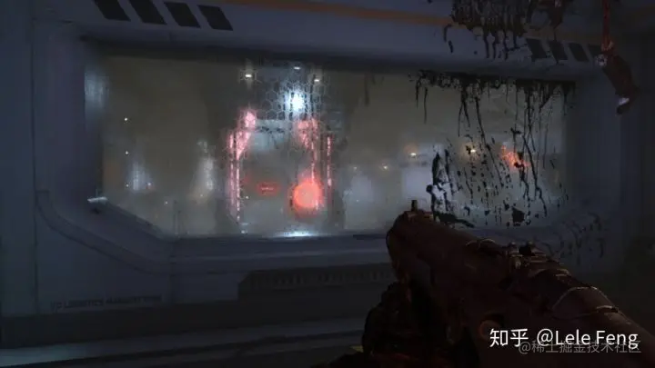 DOOM 里的毛玻璃效果很好,这里会使用 decals 来只影响玻璃的某些区域来加强或减弱折射模糊效果。Pixel shader 里会计算当前的折射模糊系数,然后从上述 blurred levels 里选取最接近该模糊系数的两张 maps,在它们直接做线性插值来近似得到最后的折射模糊效果。