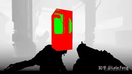 为了减少提交给 GPU 的几何体数目,我们应该尽可能把那些不在视野范围内的物体剔除掉。DOOM 的绝大部分剔除工作是使用 Umbra middleware 中间件来实现的,但它仍然做了一些 GPU culling 来进一步剔除。大致方法是,在世界空间下把一些网格分组用一个包围盒包围起来,然后把该包围盒交给 GPU 去渲染,如果经过光栅化后它所有的像素都没有通过深度测试(使用之前 depth prepass 得到的深度图),那么该包围盒中的所有物体都不需要渲染。下图中红色表示被遮挡的部分,绿色表示通过测试可视的部分: