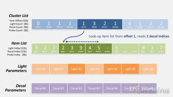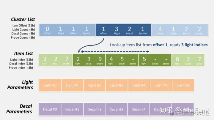 根据 cluster 中的数据得知它的 item offset 为 1,并且受 3 个 lights、2 个 decals 和 1 个 probes 影响。接着,我们按 offset 1 访问 item list,并依次读取 3 个 items 数据,其中 light index(12 bits)即为影响该 cluster 的 3 个 lights 索引: