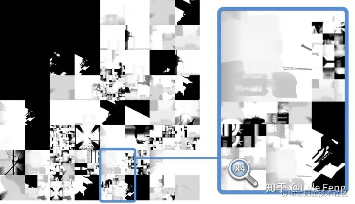 对于每个需要投射阴影的光源,会为它生成一张 depth map,并存储到一张 8k × 8k 的 texture atlas 里。为了优化,并不是所有 depth map 都需要实时更新。DOOM 大量重用了上一帧的结果,每一帧只为那些需要更新 depth maps 更新深度值。下图分别显示了前一帧和当前帧的 8k × 8k 的 depth buffer,可以看出只有更少一部分发生了变化: