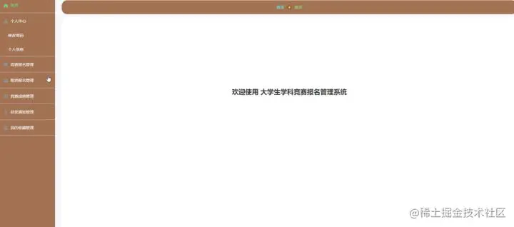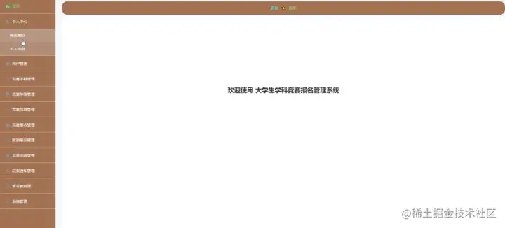 用户登录进入系统后台可以查看首页、个人中心、竞赛报名管理、取消报名管理、竞赛成绩管理、获奖通知管理、我的收藏管理等信息进行详细操作,如图5-15所示。