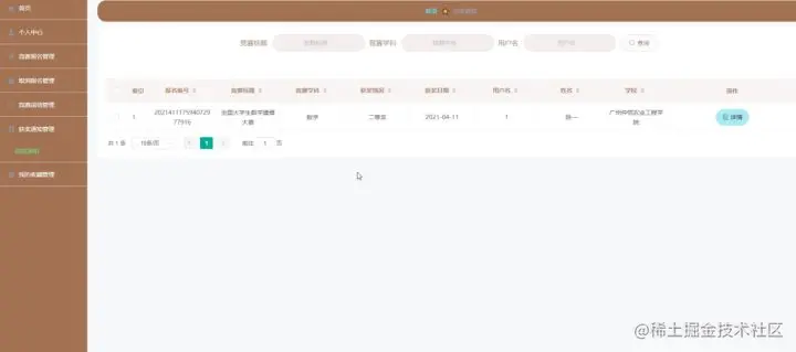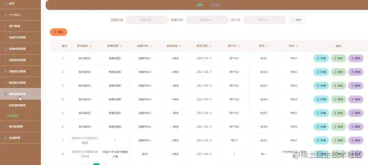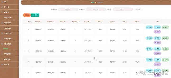 竞赛学科管理,在竞赛学科管理页面中可以对索引、竞赛学科等信息进行详情,修改或删除等操作,如图5-8所示。