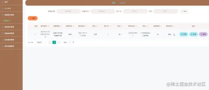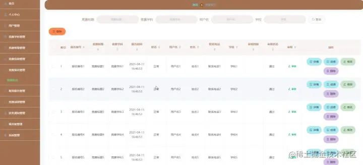 竞赛报名管理,在竞赛报名管理页面中可以对索引、报名编号、竞赛标题、竞赛学科、报名时间、状态、用户名、姓名、联系电话、学校、审核回复、审核状态等信息进行详情、取消、删除等操作,如图5-16所示。