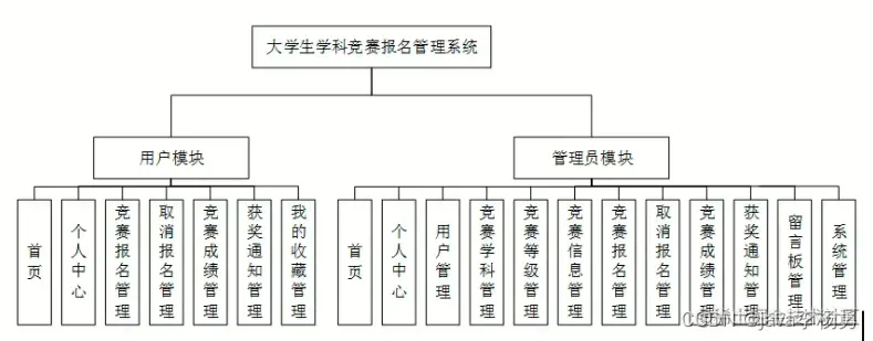 系统架构图属于系统设计阶段,系统架构图只是这个阶段一个产物,系统的总体架构决定了整个系统的模式,是系统的基础。大学生学科竞赛报名管理系统的整体结构设计如图所示。