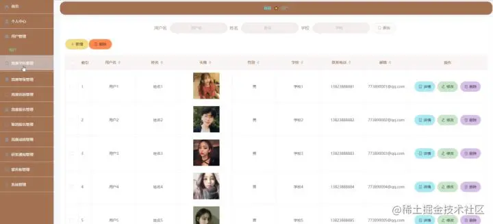 用户管理,在用户管理页面中可以对索引、用户名、姓名、头像、性别、学校、联系电话、邮箱等信息进行详情,修改或删除等操作,如图5-7所示。