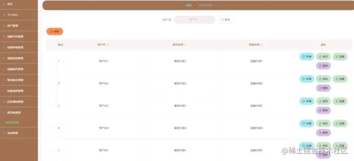 留言板管理,在留言板管理页面中可以对索引、用户名、留言内容、回复内容等信息进行详情、回复、修改或删除等操作,如图5-13所示。