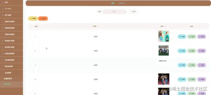 系统管理,在竞赛资讯页面中可以对索引、标题、图片等信息进行详情,修改或删除等操作,还可对轮播图管理进行操作,如图5-14所示。