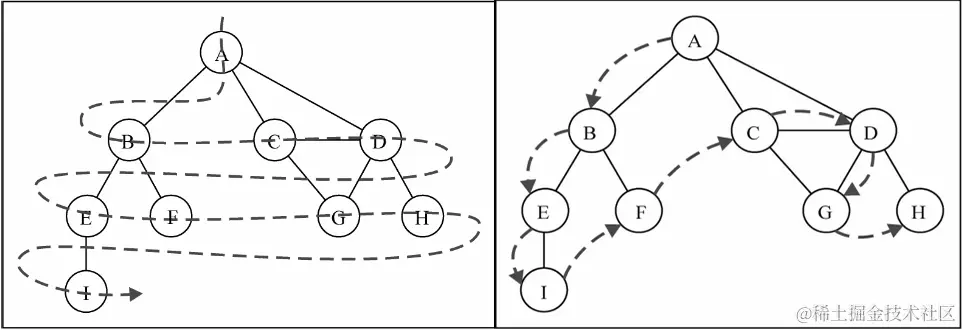(2)深度优先搜索算法(Depth-First-Search,DFS)会从根结点开始遍历,沿着路径直到这条路径最后一个叶结点被访问,接着原路回退并探索下一条路径,也就是先深度后广度地访问结点,如下图右半部分。