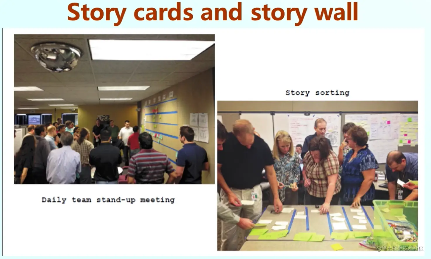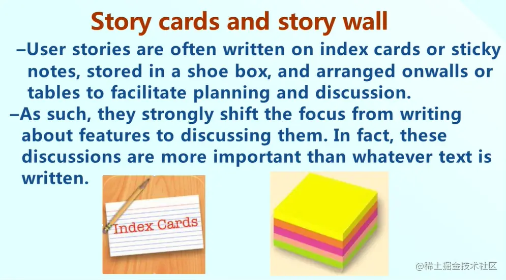那么Story呢常常写在卡片上,所以称为Story cards,然后可以部署到墙上,可以讨论,这些都代表着需求分析从传统的写需求过程到讨论需求的过程。
