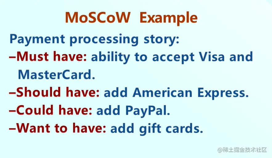 例如采用MosCoW规则对某一个支付功能Story来排序,其中Must have是系统必须接受Visa卡和Master卡,Should have是可以增加美国信用卡,Could have可以增加PayPal卡,Want to have可以考虑最后增加礼品卡。