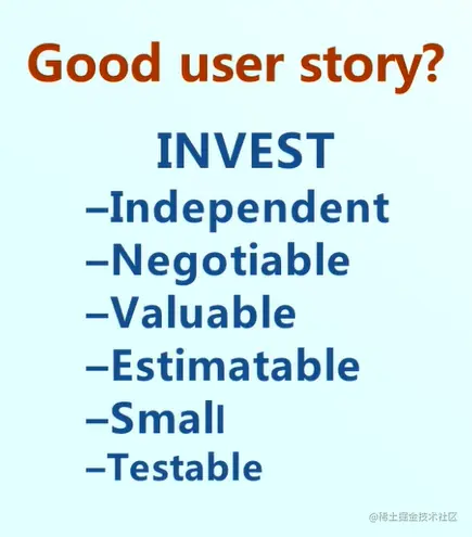 那么如何评价一个story是一个好的story呢?有一些标准是可以参考的。例如INVEST,那么他就描述了好的story的六个特征:I代表独立特征,N代表清晰描述,V代表需求的价值特征,E&S代表比较小,足以进行估算。