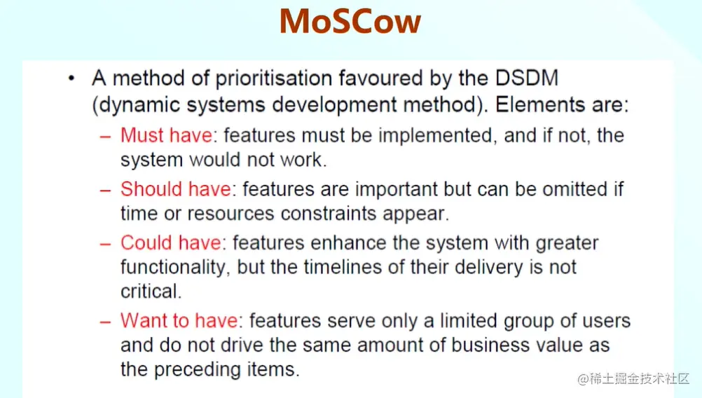 例如MoSCow,他是对Must have(系统必须实现的功能,否则系统无法运行),Should have(虽然很重要,但是可以省略的功能),Could have(扩展性功能,但是要求不是很低),Want to have(一部分用户的想法)来进行排序的。