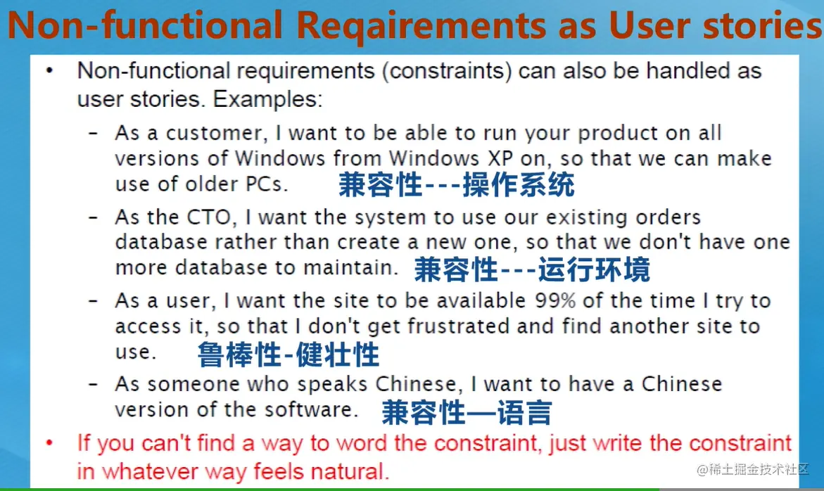 我们知道需求分为功能性需求和非功能性需求,我们前面用Story描述了功能需求。其实也可以用Story来描述非功能性需求,例如我们可以看:这是用Story来描述的非功能性需求,描述了系统,运行环境,开发语言的兼容性以及系统的健壮性。