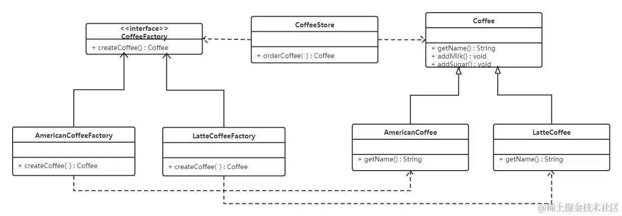LatteCoffee类、AmericanCoffee类) - 具体工厂 :提供了创建产品的方法,调用者通过该方法来获取产品