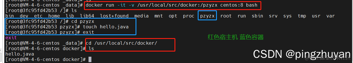 docker 容器运行 bash交互 把container-vol数据卷 挂载到 在centos:8 的 pzyzx 文件夹中