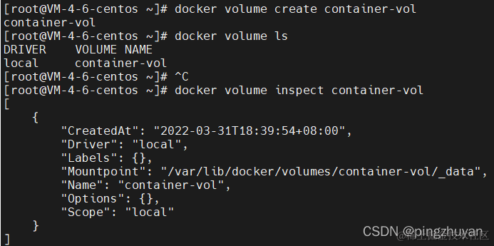 docker run -it --mount source=container-vol,target=/pzyzx centos:8 bash