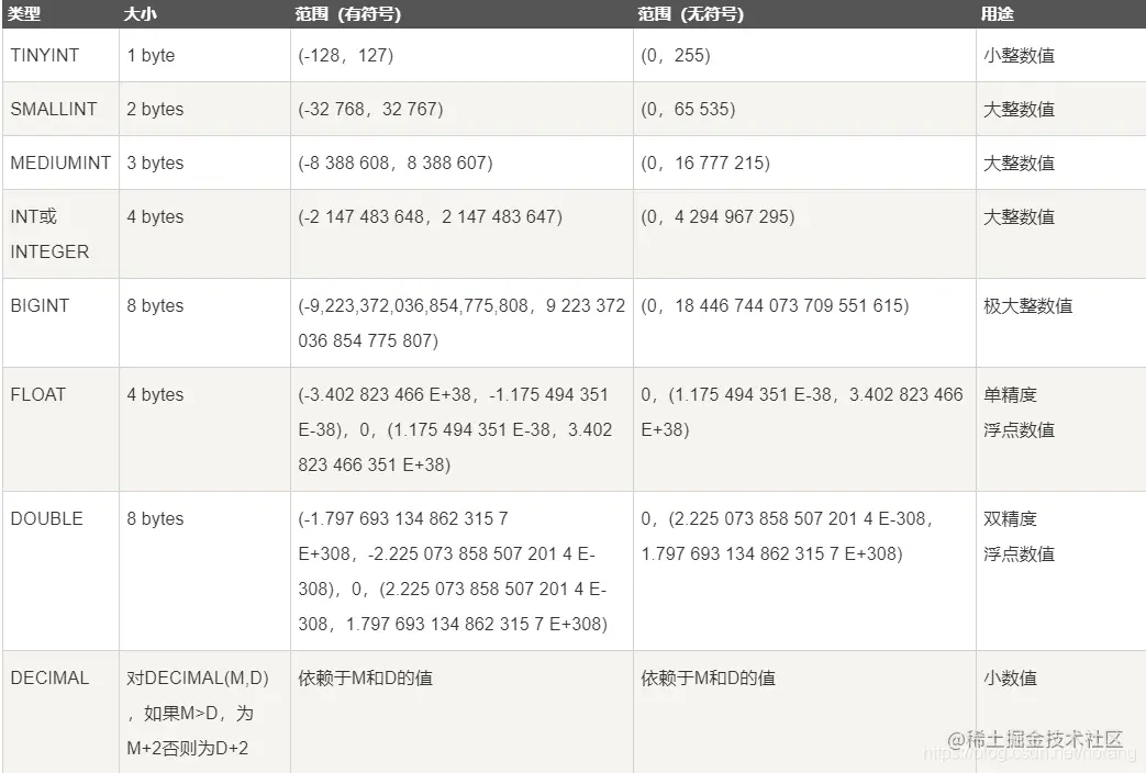 先来看看下面这张图,了解一下mysql各个类型的大小