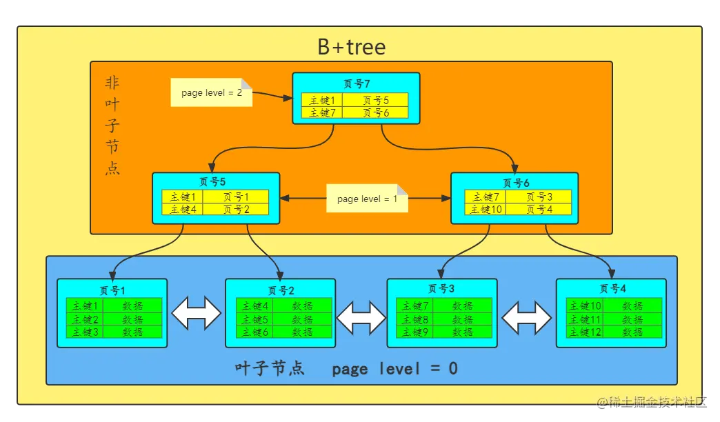 在《索引基本原理》中解释了InnoDB索引是基于B+tree实现的,InnoDB在构建B+tree结构时,一般会找出每个数据页中id最小(或者说索引最小, InnoDB主键即聚簇索引)的记录与其对应的页号,将id与页号组成一个新的记录,存储在一个新生成的数据页中,其大小也为16K,为与存储数据的数据页区分,引入了数据页之间的上下层级关系,也就是页层级(page level)。因此我们知道在B+tree中分为两部分: