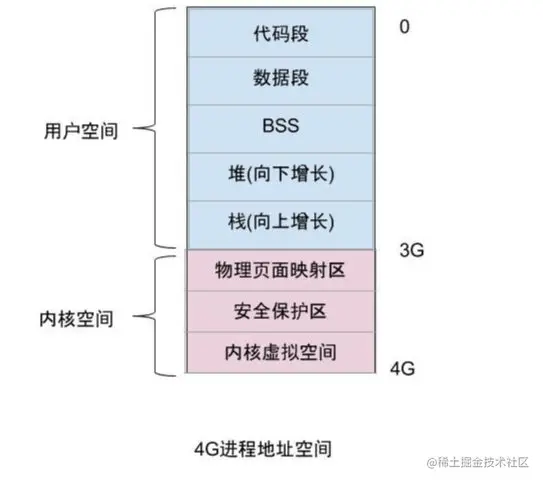 4G进程地址空间被划分两部分,内核空间和用户空间。用户空间从0到3G,内核空间从3G到4G;