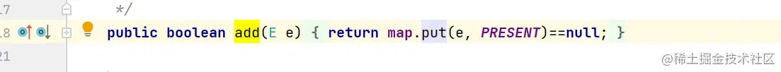 首先我们看看add方法,前面我们说了一嘴,这里的add实际就是map的put方法,并以你要add的值进行hash,具体的put操作我们可以在后面的map里说,这里方便记忆就是set的add方法会把我们要塞的值当做map的key来进行存储且判断是否存在,以此达到去重的目的;