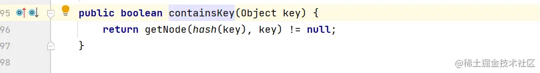 contains方法调用了map的containsKey方法,该方法调用了getNode方法,这里可以理解成get我们的key,如果get到了则返回该值,如果没get到则返回null,这里的get虽然都和hash相关,但看源码我们依然可以看到equals,以此达到结果的稳定性,最终我们根据结果是否为null决定返回true或FALSE;