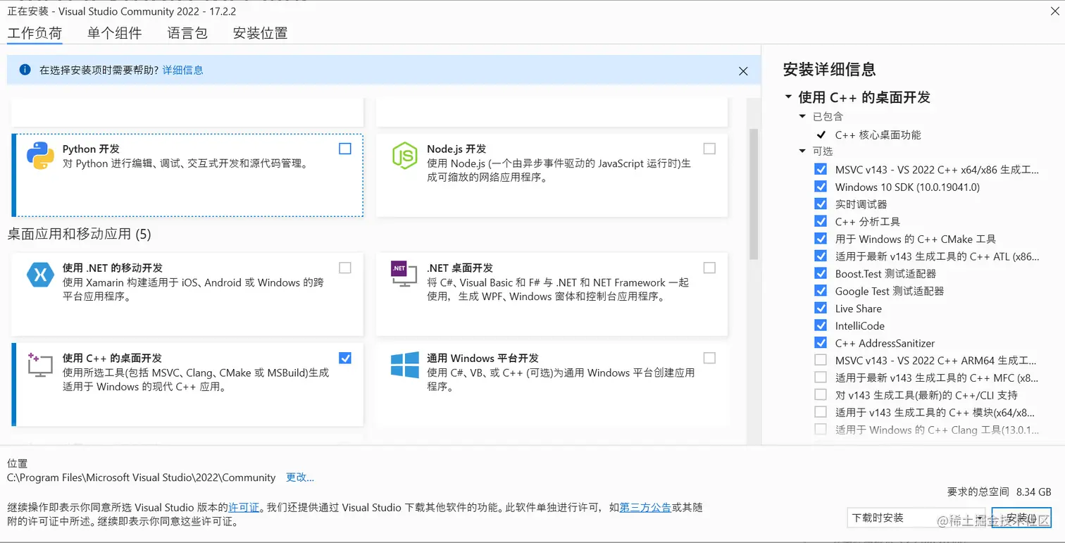 进入visualstudio.microsoft.com/zh-hans/dow… 下载社区版即可,勾选使用C++的桌面开发点击安装,等待安装完成。