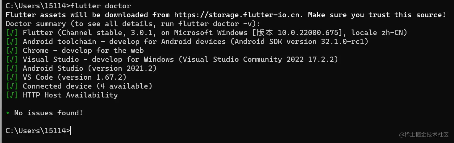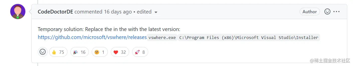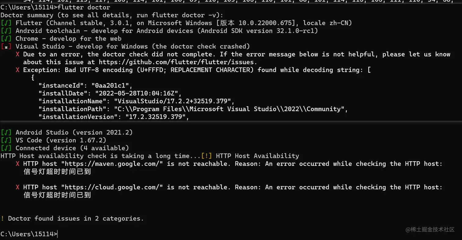 这个错是由于2022这个版本出现的错误,可以进入github.com/flutter/flu… 查看,只有临时解决方案,根据指引下载vswhere.exe发放入指定目录下,再使用flutter doctor测试。