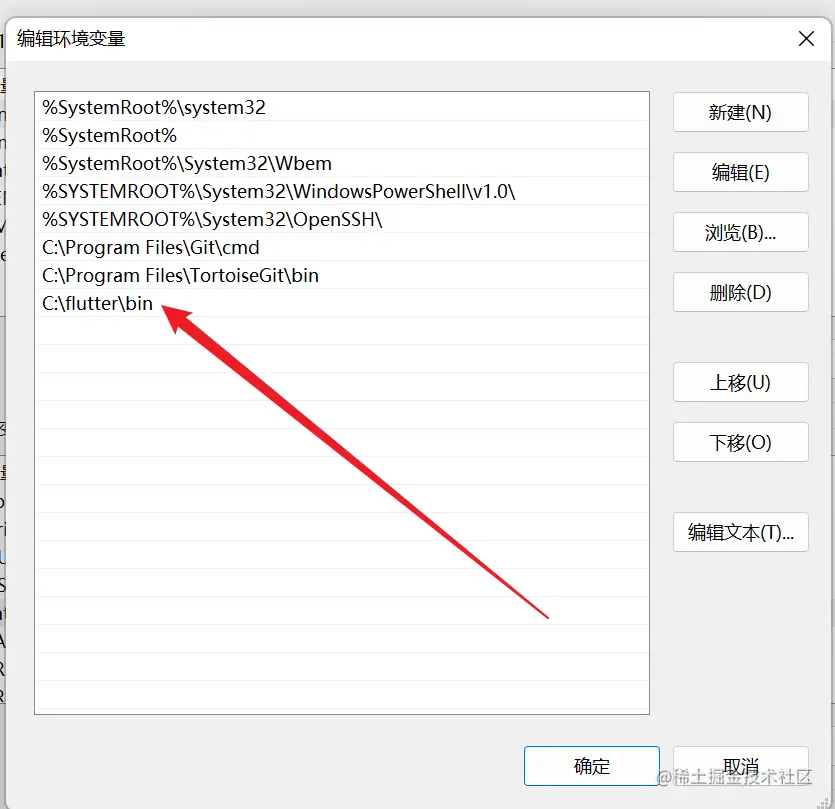 将flutter目录下bin的地址填入环境变量path中,重启电脑或注销。