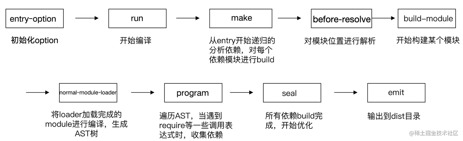 最终会根据配置参数实例化 webpack 对象,然后执行构建流程