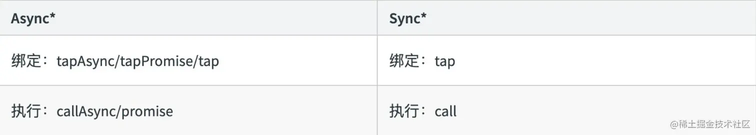 Tabpack 提供了同步&异步绑定钩子的方法,并且他们都有绑定事件和执行事件对应的方法。