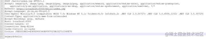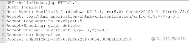 - 第一行:Get请求,请求服务器路径是/hello/index.jsp,协议版本为1.1