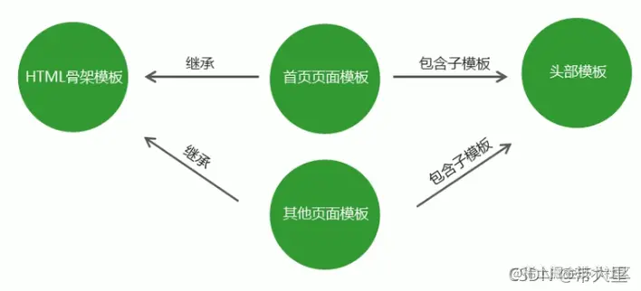 使用模板继承可以将网站HTML骨架抽离到单独的文件中,其他页面模板可以继承骨架文件