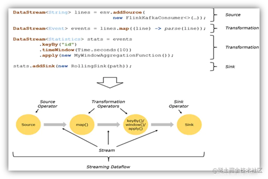 Source负责读取数据源,Transformation利用各种算子进行处理加工,Sink负责输出。