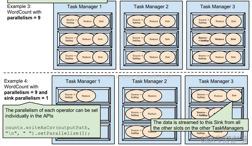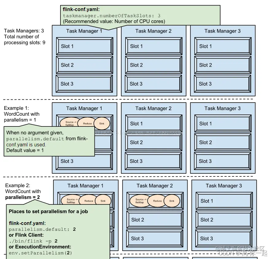 也就是说,假设一共有3个TaskManager,每一个TaskManager中的分配3个TaskSlot,也就是每个TaskManager可以接收3个task,一共9个TaskSlot,如果我们设置parallelism.default=1,即运行程序默认的并行度为1,9个TaskSlot只用了1个,有8个空闲,因此,设置合适的并行度才能提高效率。