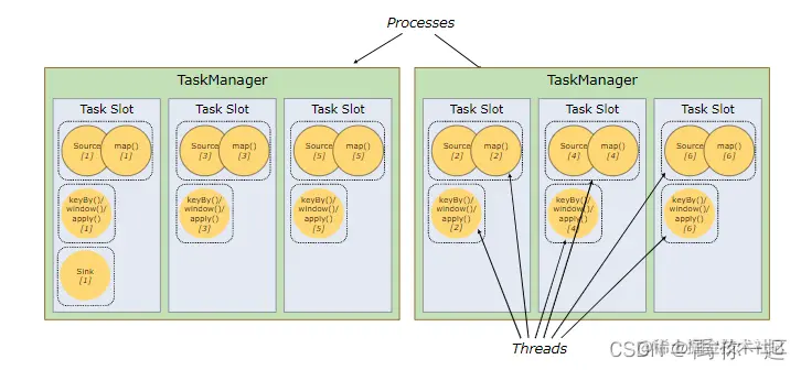 Flink中每一个worker(TaskManager)都是一个JVM 进程,它可能会在独立的线程上执行一个或多个subtask。为了控制一个worker能接收多少个task,worker通过task slot来进行控制(一个worker至少有一个task slot)。