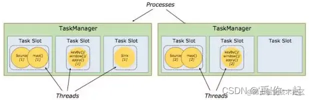 Task Slot 是静态的概念,是指TaskManager 具有的并发执行能力,可以通过参数taskmanager.numberOfTaskSlots进行配置;而并行度 parallelism 是动态概念,即TaskManager 运行程序时实际使用的并发能力,可以通过参数parallelism.default进行配置。