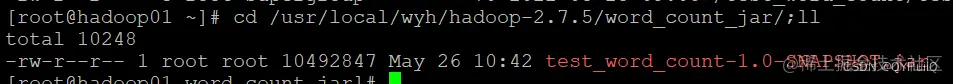 [root@hadoop01 word_count_jar]# hadoop jar test_word_count-1.0-SNAPSHOT.jar wyh.test.mapreduce.WordCountMain